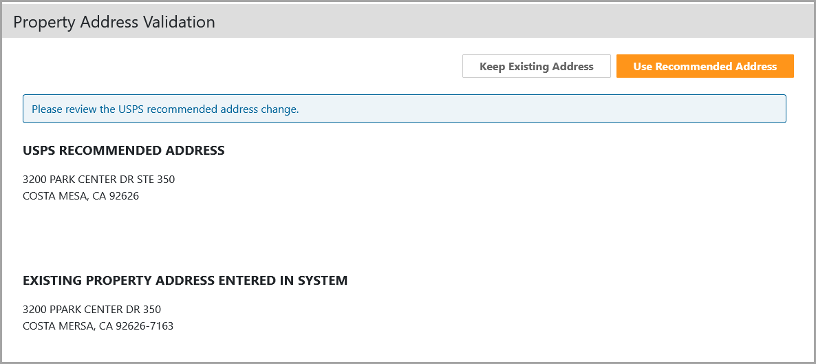The platform will check the property address against the USPS database and provide any recommended changes. If changes are suggested, please select Use Recommended Address to update the address or Keep Existing Address to ignore this recommendation.