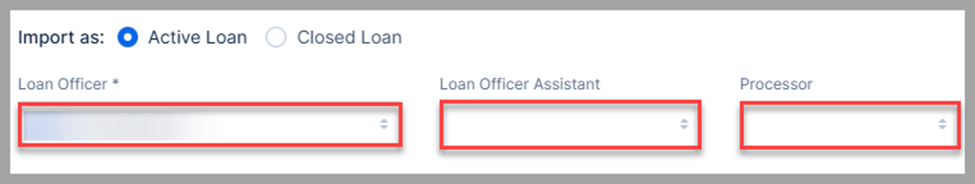 The Loan Officer should automatically be selected but can be updated. Addiitionally, Loan Officer Assistant and Processor can also be assigned but are not required.