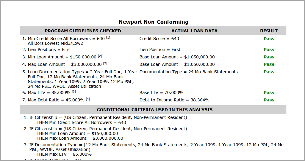 The AUS findings will display the loan information used, individual program guidelines, and messages relating to the eligibility of the loan. Below is a sample of these from a test loan.