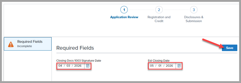 Complete the Closing Docs 1003 Signature Date (1003 Date) and the Est Closing Date. Click Save to progress.