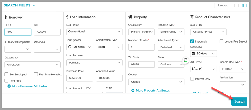 Scenario data will pull from the loan application. Verify each section, entering any missing information. Once all parameters are verified, click Search.