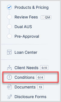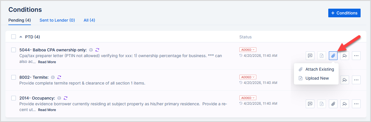 New conditions will start in Added status. To upload or attach an existing document to a condition, click the Attach or Upload Document (paperclip) button, then choose whether to Attach Existing or Upload New.
