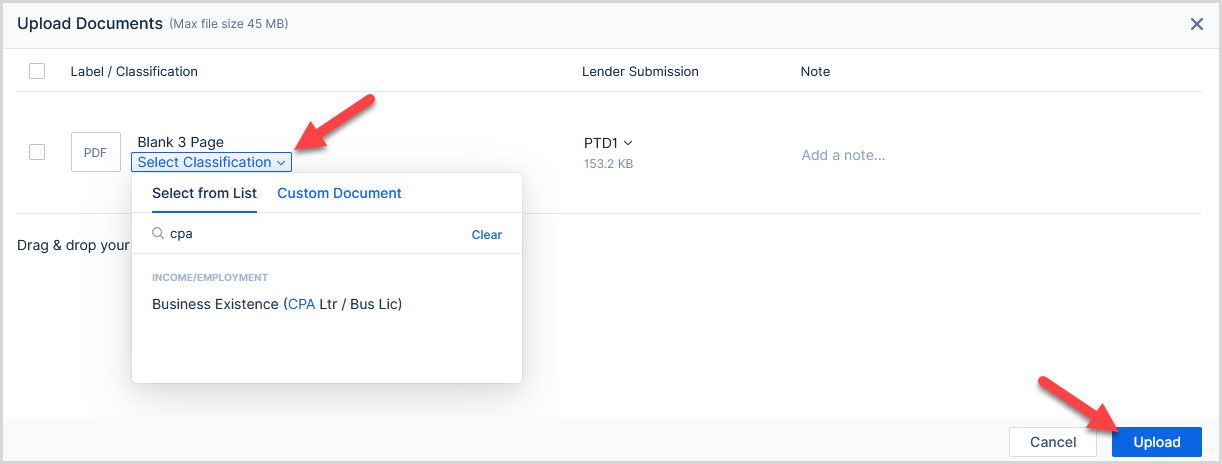 Browse or drag and drop your document(s), select a Classification, then click Upload.