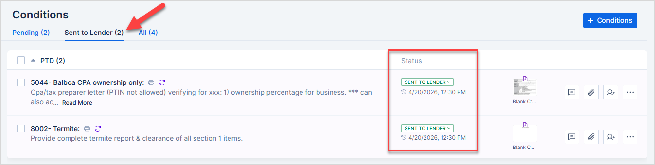 You'll receive a notification when conditions are successfully sent, and the sent conditions will move to the Sent to Lender tab and reflect a Sent to Lender status.