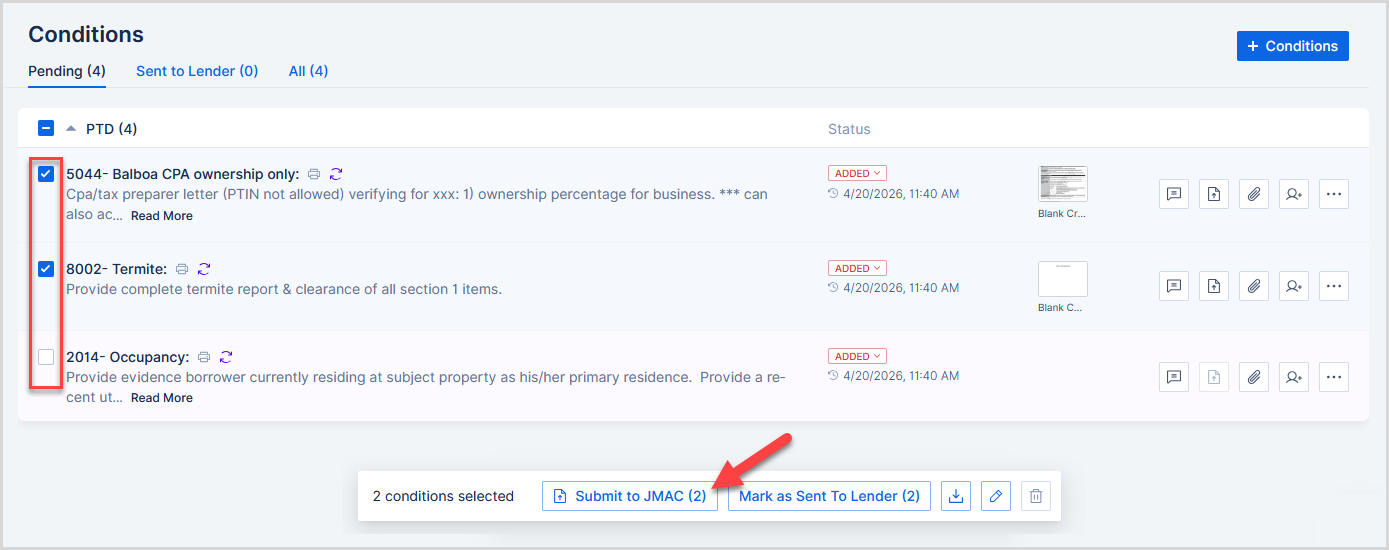 When ready to send conditions to JMAC, click the checkbox next to each ready condition, then click Submit to JMAC.