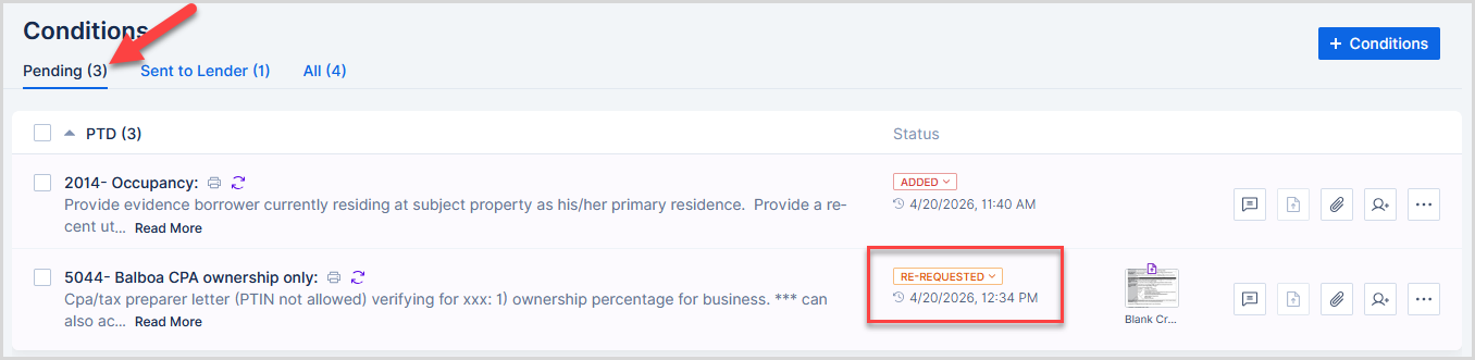 If additional documentation is required by the Underwriter, the condition will return to the Pending tab with a status of Re-Requested. Continue with the previous steps until all conditions have been signed off.